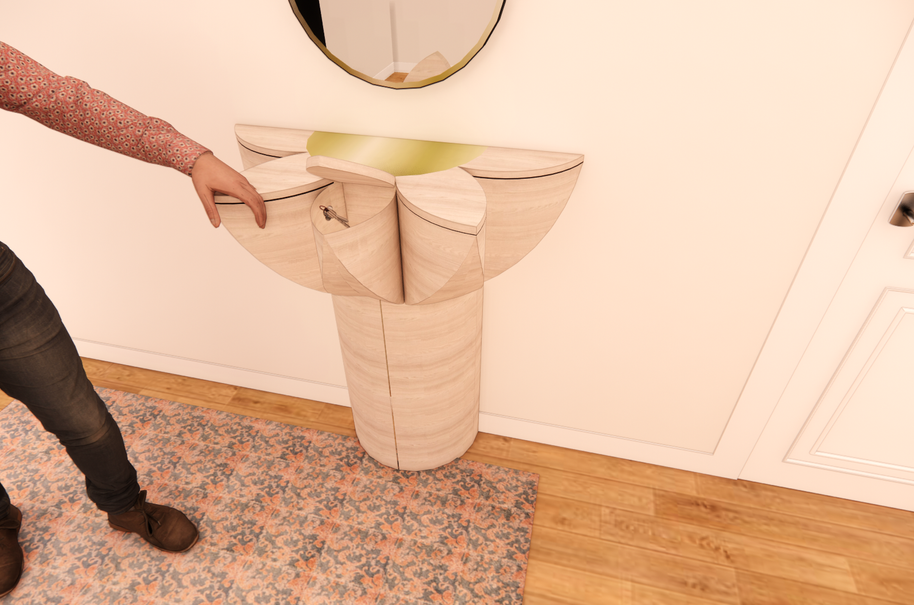 For this design I have chosen a flower. The flower has 5 petals which double as storage compartments. The stem has two cabinet doors that open up to reveal three shelves for storage. Also within the stem there is an electrical path for phone chargers to weave through so clients will be able to charge their phones without the cords being visible.